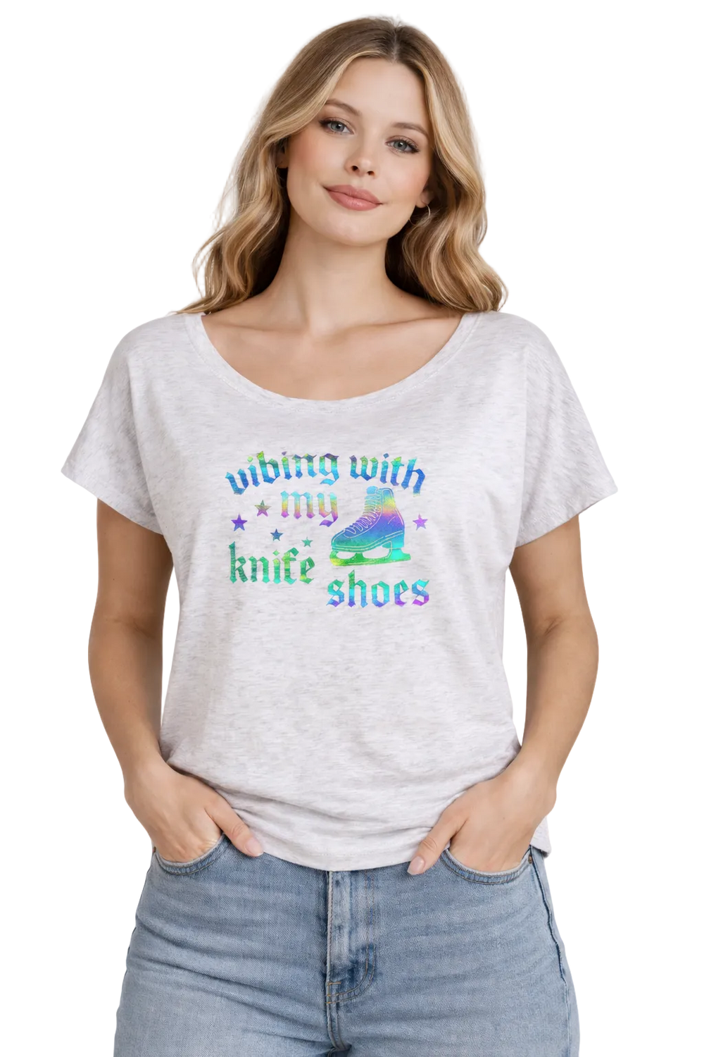 Gothic lettering meets skating attitude. This exclusive women's dolman features "vibing with my knife shoes" in bold old English-style typography with a classic skate graphic, all rendered in sleek black reflective rainbow. In normal lighting, it's a subtle statement on soft heather white—but catch it in a flash and BAM—the text and skate explode in full rainbow gradient from turquoise through pink to yellow. It's the perfect blend of vintage typography and modern reflective tech.