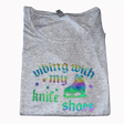 - Design: Gothic-style "vibing with my knife shoes" text with skate graphic in black reflective rainbow