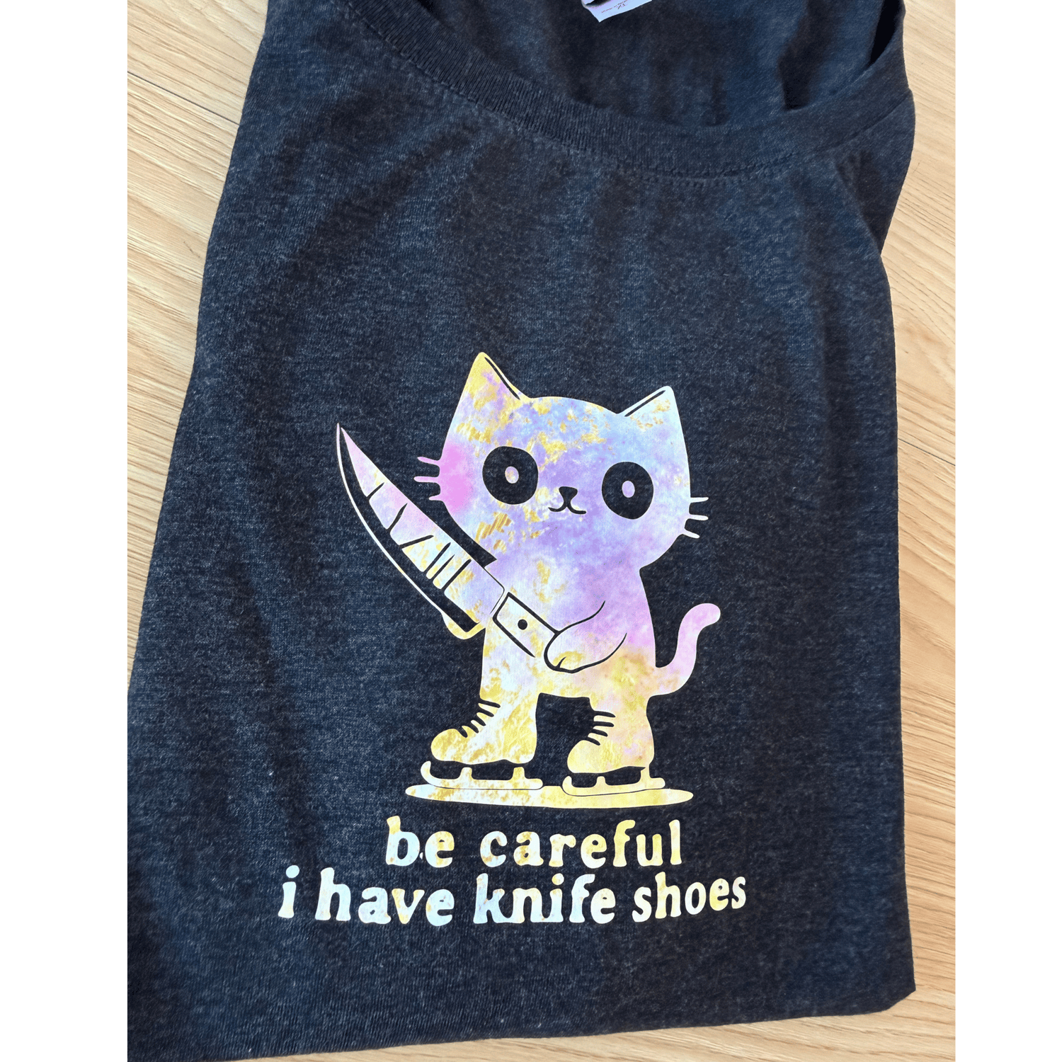 - Features: Classic long sleeve fit, playful "be careful i have knife shoes" text, whimsical cat illustration with skates