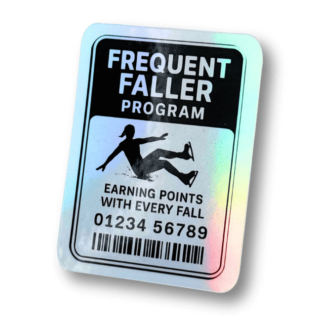 If you're a figure skater, you know the truth: falling is part of the journey! This hilarious holographic sticker celebrates your membership in the Frequent Faller Program, where you earn points with every fall. Complete with a barcode and membership number, this sticker is a badge of honor for skaters who get back up again and again.