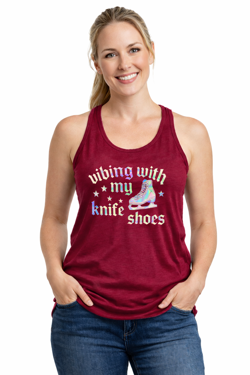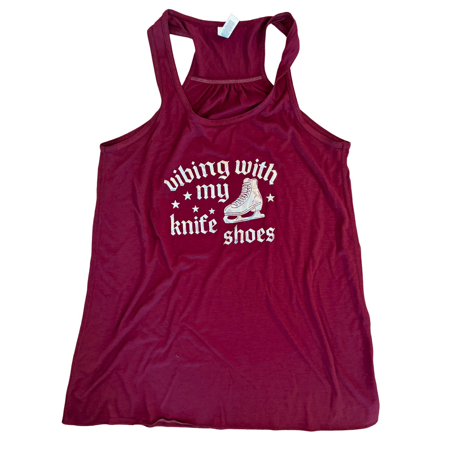 This women's flowy racerback tank features our signature "Vibing With My Knife Shoes" design in stunning holographic heat transfer vinyl that shifts and shimmers with every movement. The holographic finish catches the light beautifully, creating an eye-catching iridescent effect that's impossible to ignore.