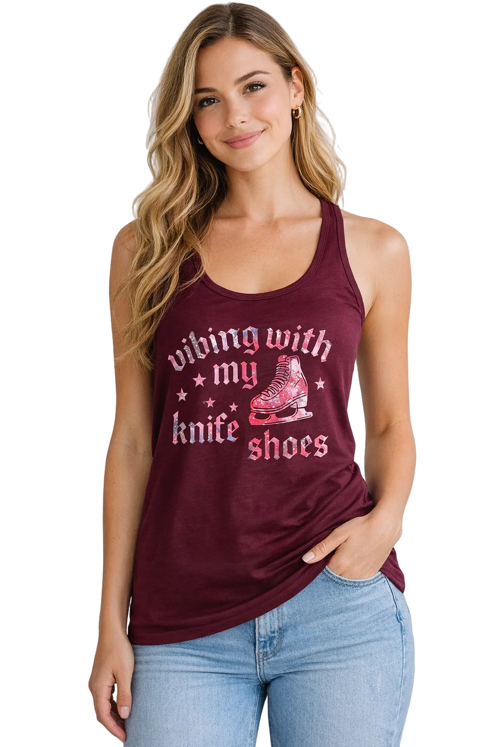 Because that's what they are—knives strapped to your feet. This exclusive women's racerback tank features playful gothic lettering with a stunning pink cosmic galaxy pattern that shifts through vibrant pink, purple, blue, and teal tones with scattered stars, plus a vintage-style figure skate graphic. It's the perfect mix of edgy and cosmic.